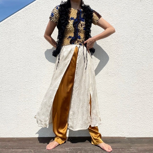<Brand> <Size> 総丈:103cm ウエスト(平置き×2):34cm ※後身は平ゴム入り 着用モデル 163cm ※平置きにて採寸しております。 多少の誤差はご了承くださいませ。 ________________________________________ 大胆なボリューム感のスカート。 着用するだけで踊りたくなるようなシルエットです。 オーガーンジーの素材にはさりげなくドット柄のフロッキーが施されているデザイン。 裏地もしっかり着いているので安心して着用できます。 程よいワッシャー感がスタイリングの動きを出してくれてとてもかわいいスカートです。 ※裾上げも対応可能です 【Condition】 ・非常に良いです ________________________________________ 【返品交換について】 当店はヴィンテージの一点物を扱っておりますので返品交換は出来かねます。 ヴィンテージに慣れた方、ヴィンテージにご理解のある方向けのアイテムです。 【配送について】 ご注文の商品はヤマト運輸にて発送させていただきます。お届けのご希望日時がございましたらお申し付けくださいませ。 送料につきましては一律800円となります。
