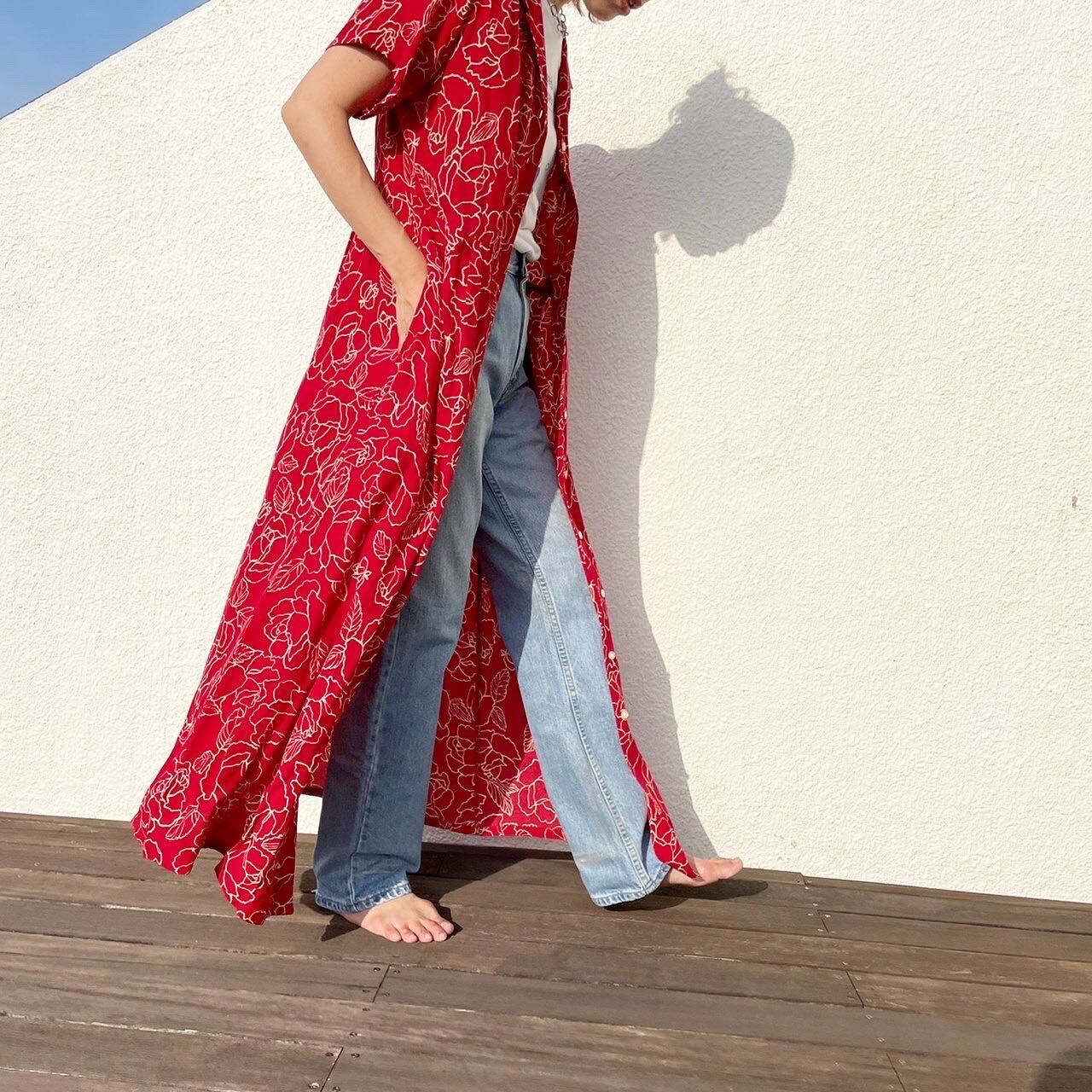 開襟シャツタイプなので羽織りとしてスタイリングを楽しむ事もでき、ワンピースとしてもがらりと変わった印象で着れる2度楽しむ事ができるワンピース。