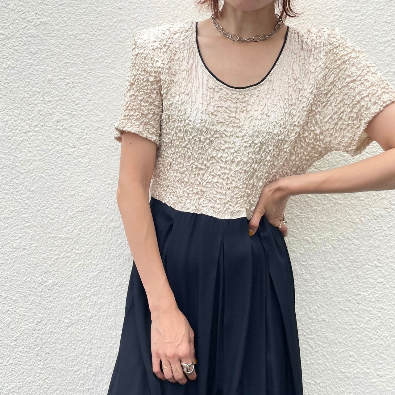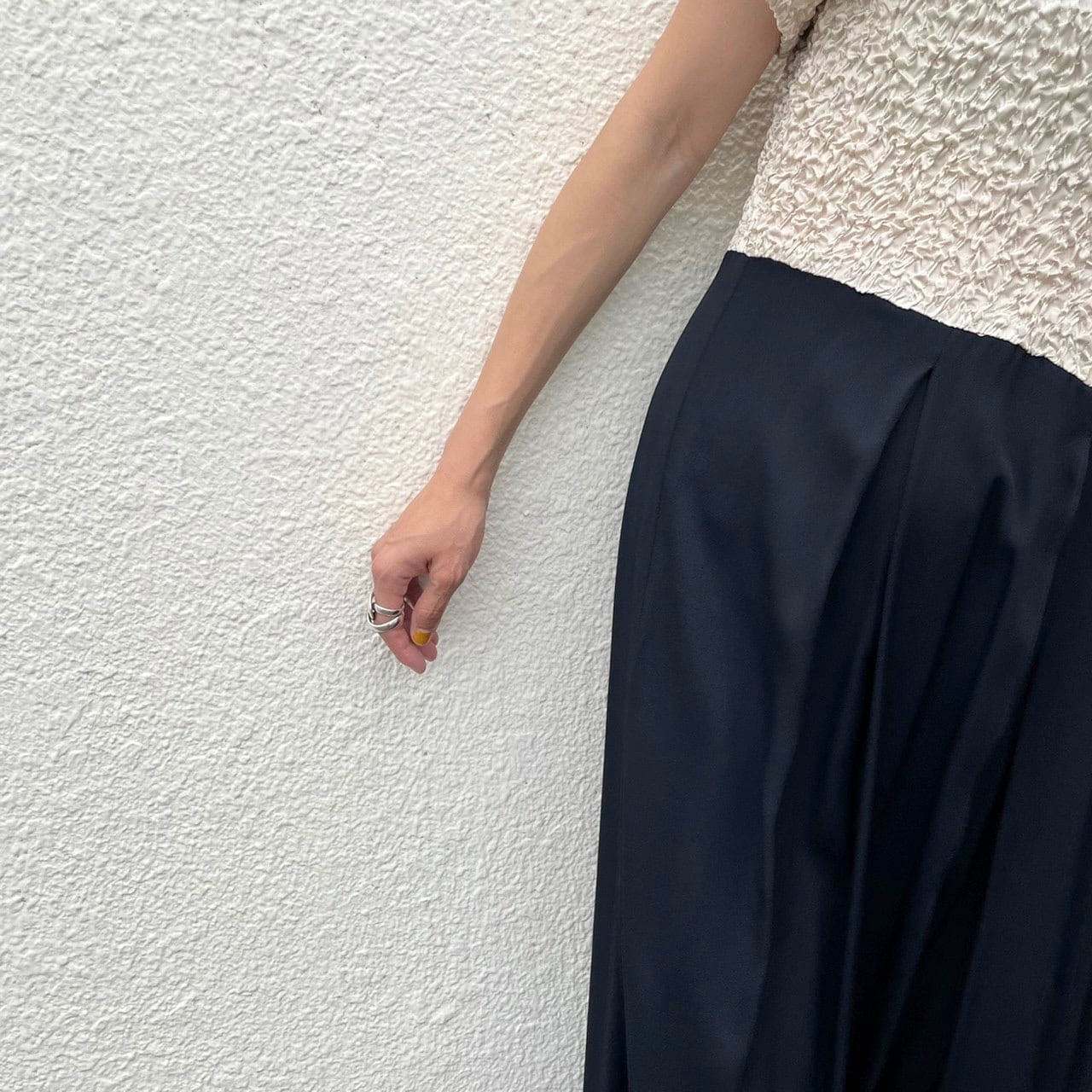 ほどよくフィットしたトップはサテン地のリップル加工が施してありぽこぽことした表情がとても可愛いです。伸縮性があり着心地が良いです。(バックにコンシールファスナー仕様)