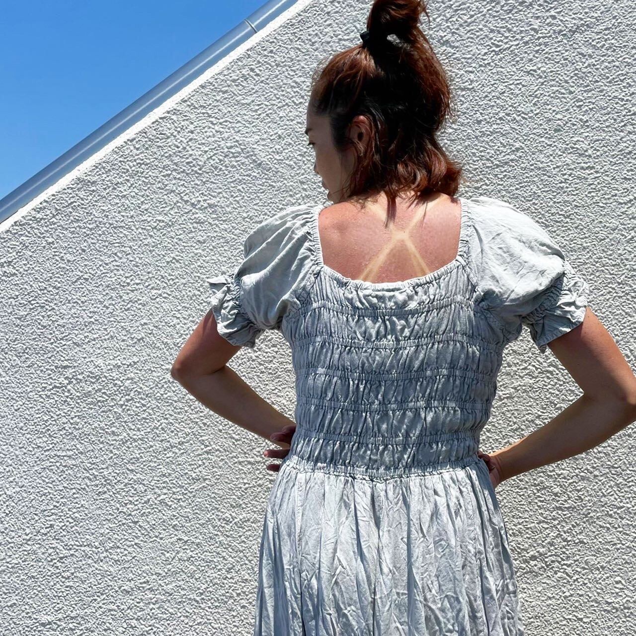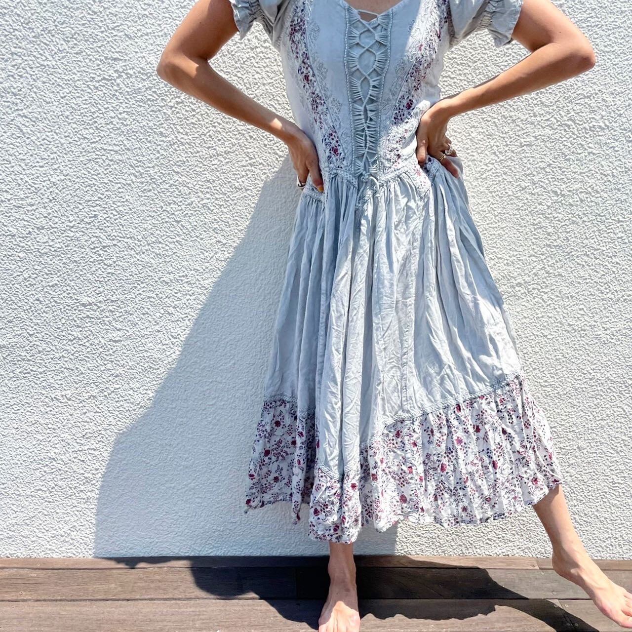 デニム合わせでボヘミアンなレイヤードスタイルで表情の変化を楽しむ事のできるドレスです。