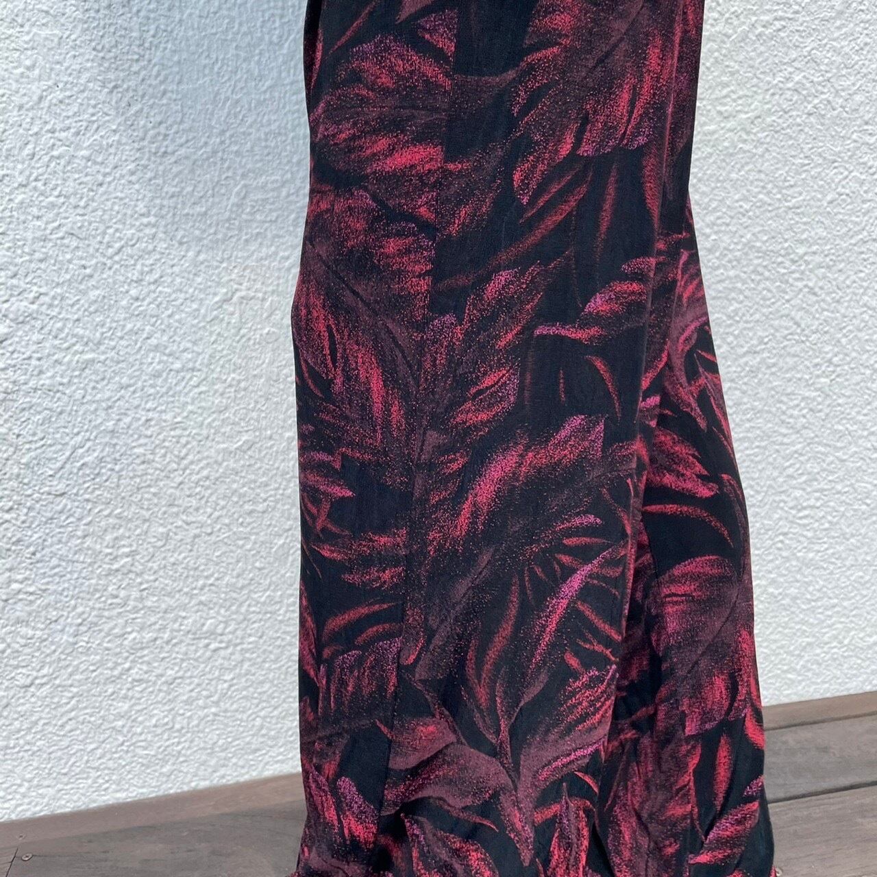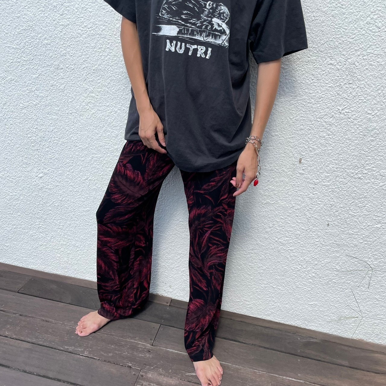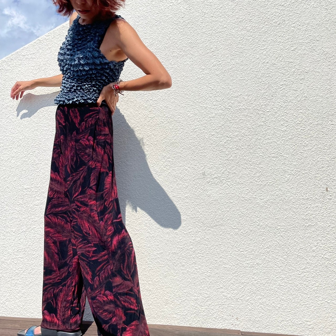 葉のシルエットが浮かび上がるプリントが雰囲気満点のカットイージーパンツ。