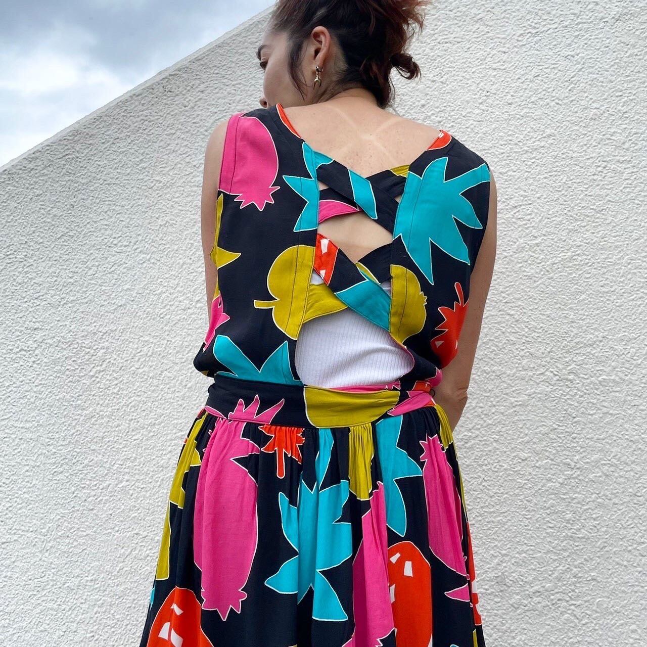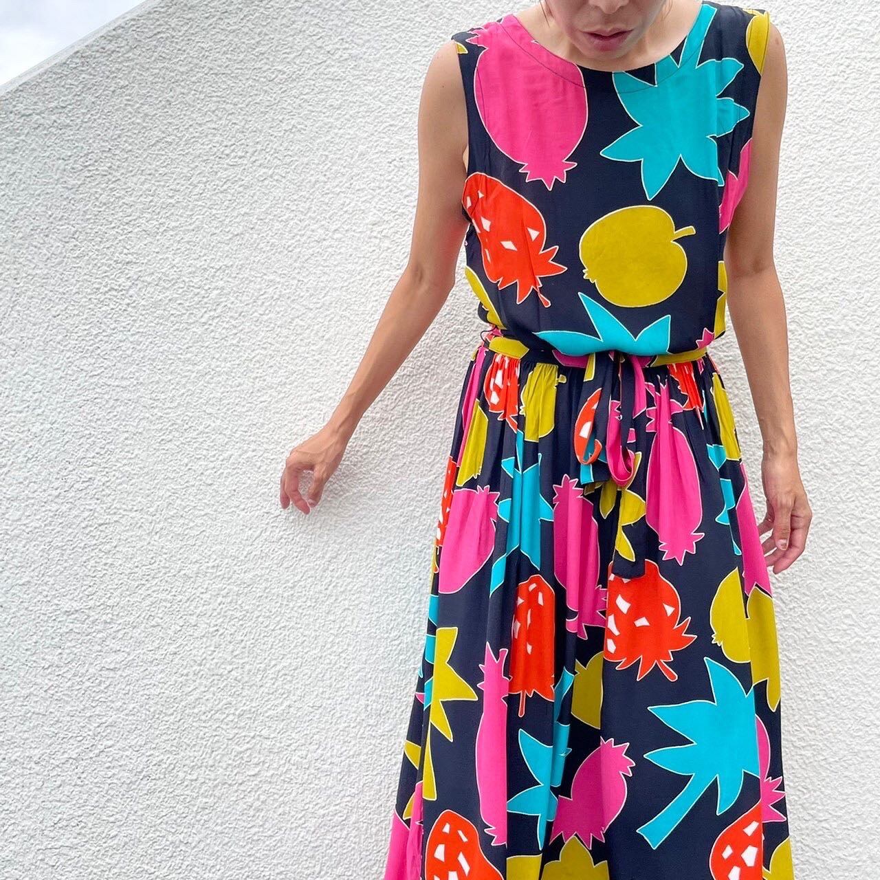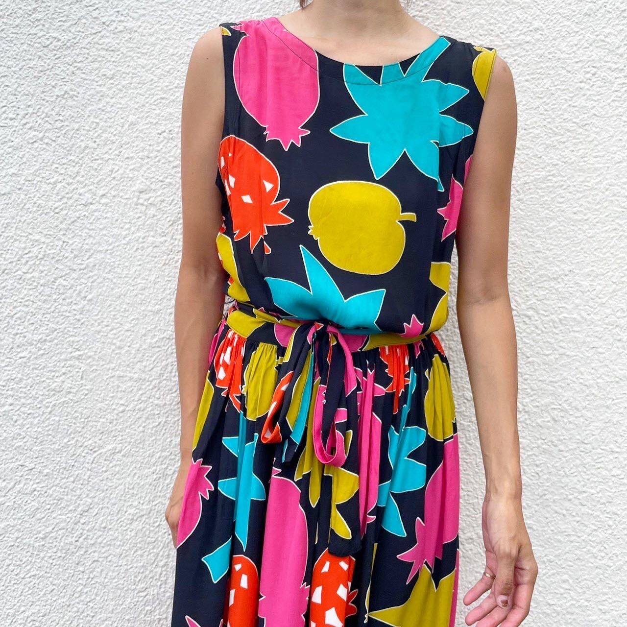 トロピカルフルーツのモチーフが大胆にプリントされ色の組み方絡み合うパターンが80年代らしい雰囲気。