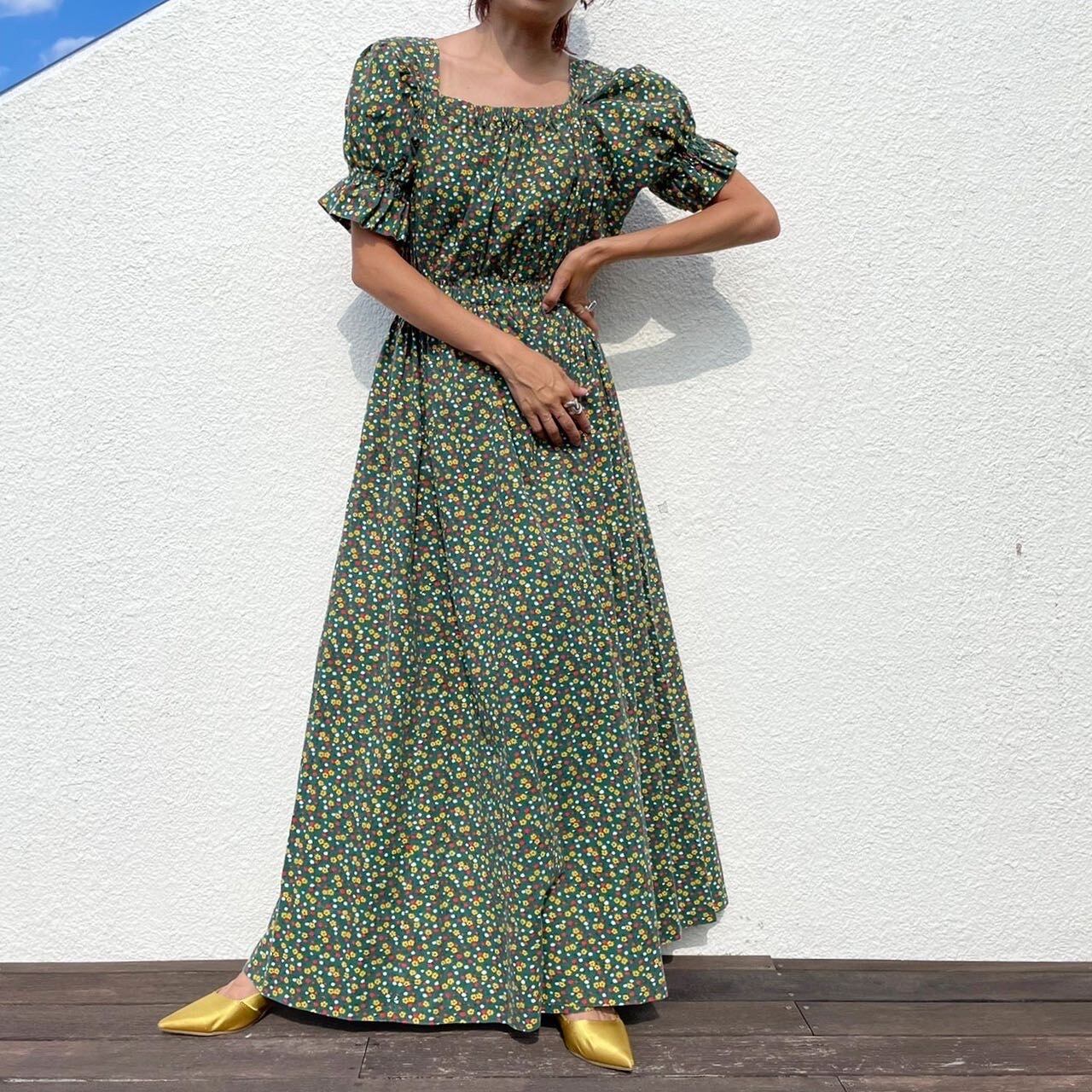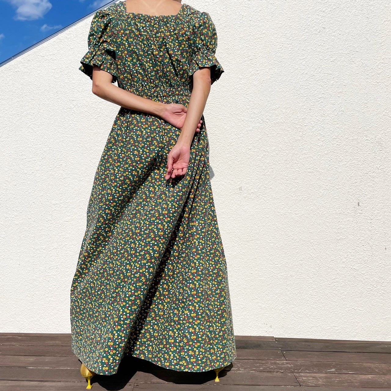 深いグリーン色にliberty柄が散りばめられているパターンは派手すぎず肌馴染みがとても良いです。