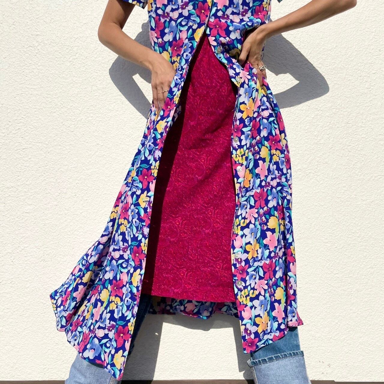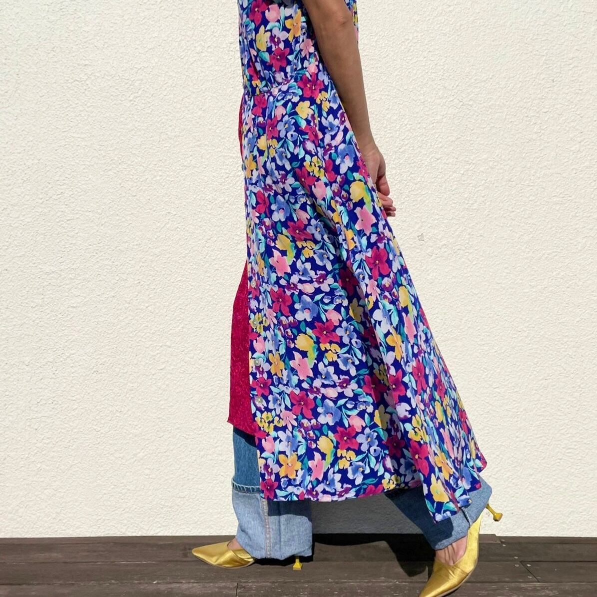 中花柄が散りばめられたノーカラーシャツワンピース。