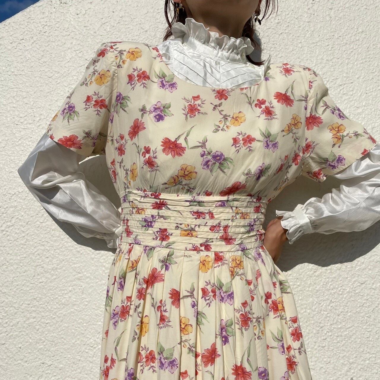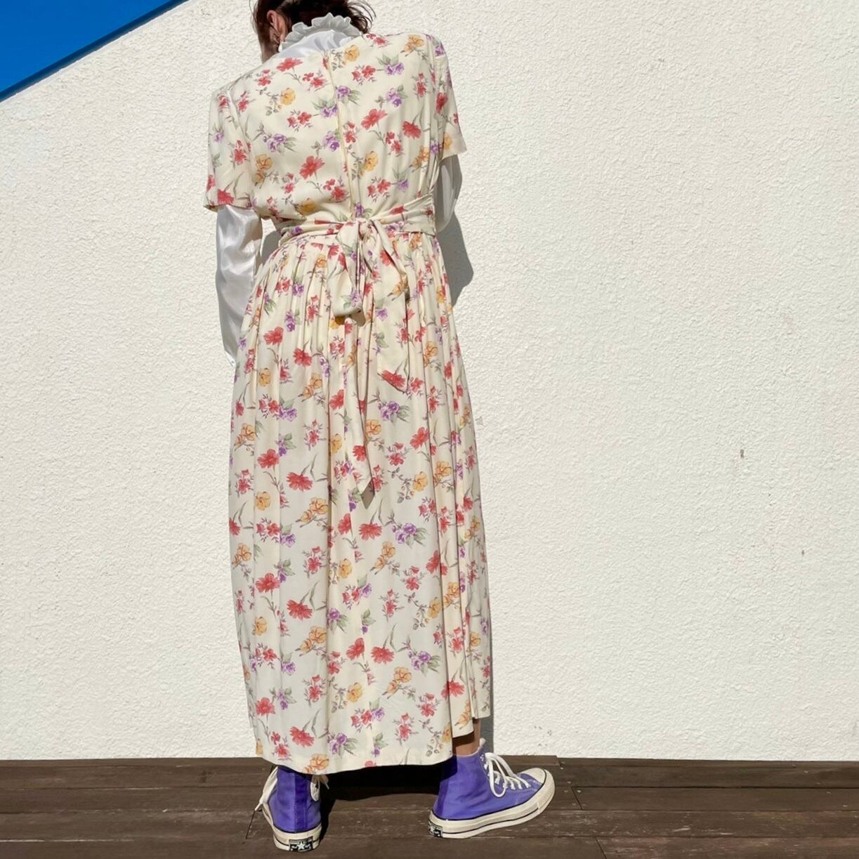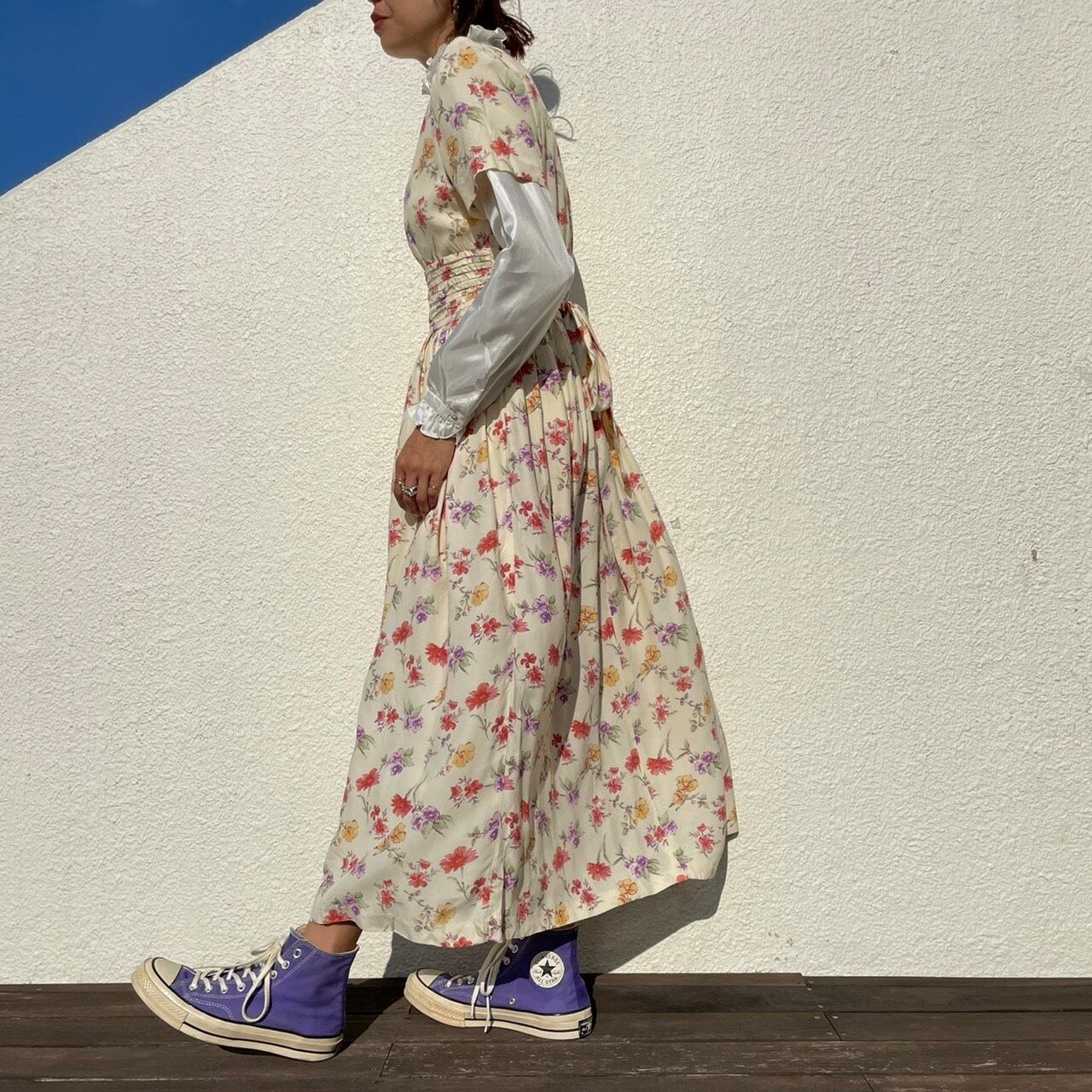 足元のスニーカー、デニムなどカジュアル物との合わせもお楽しみ頂けるガーリーなワンピース。
