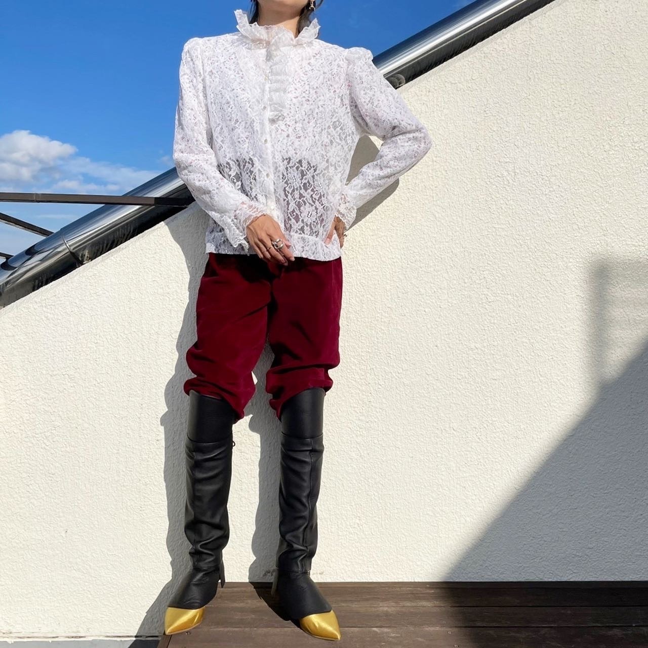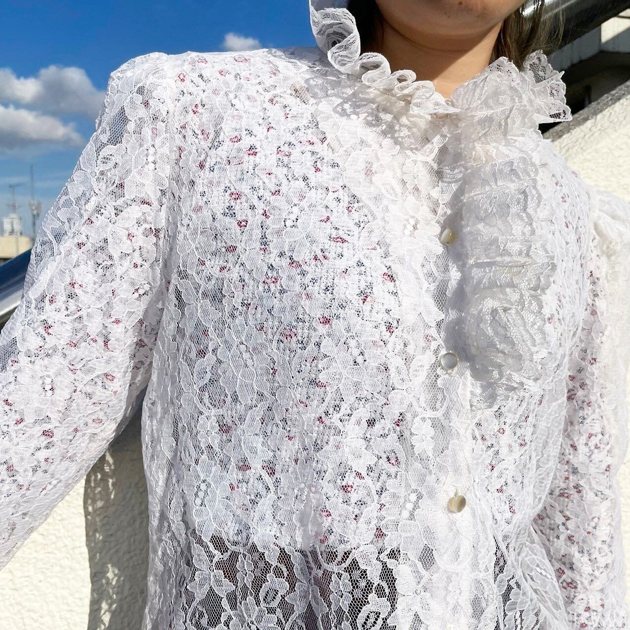 ハイネックからフロントを飾るフリルレースが美しいデザインblouse。