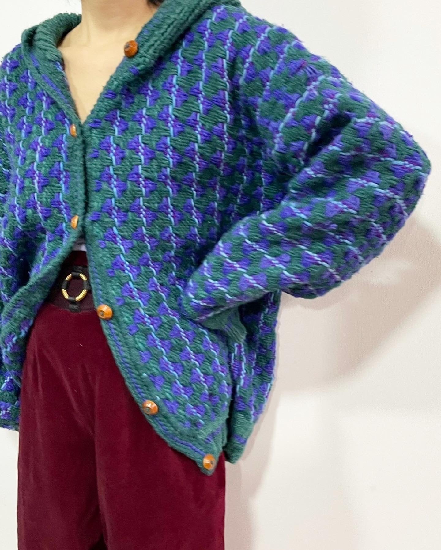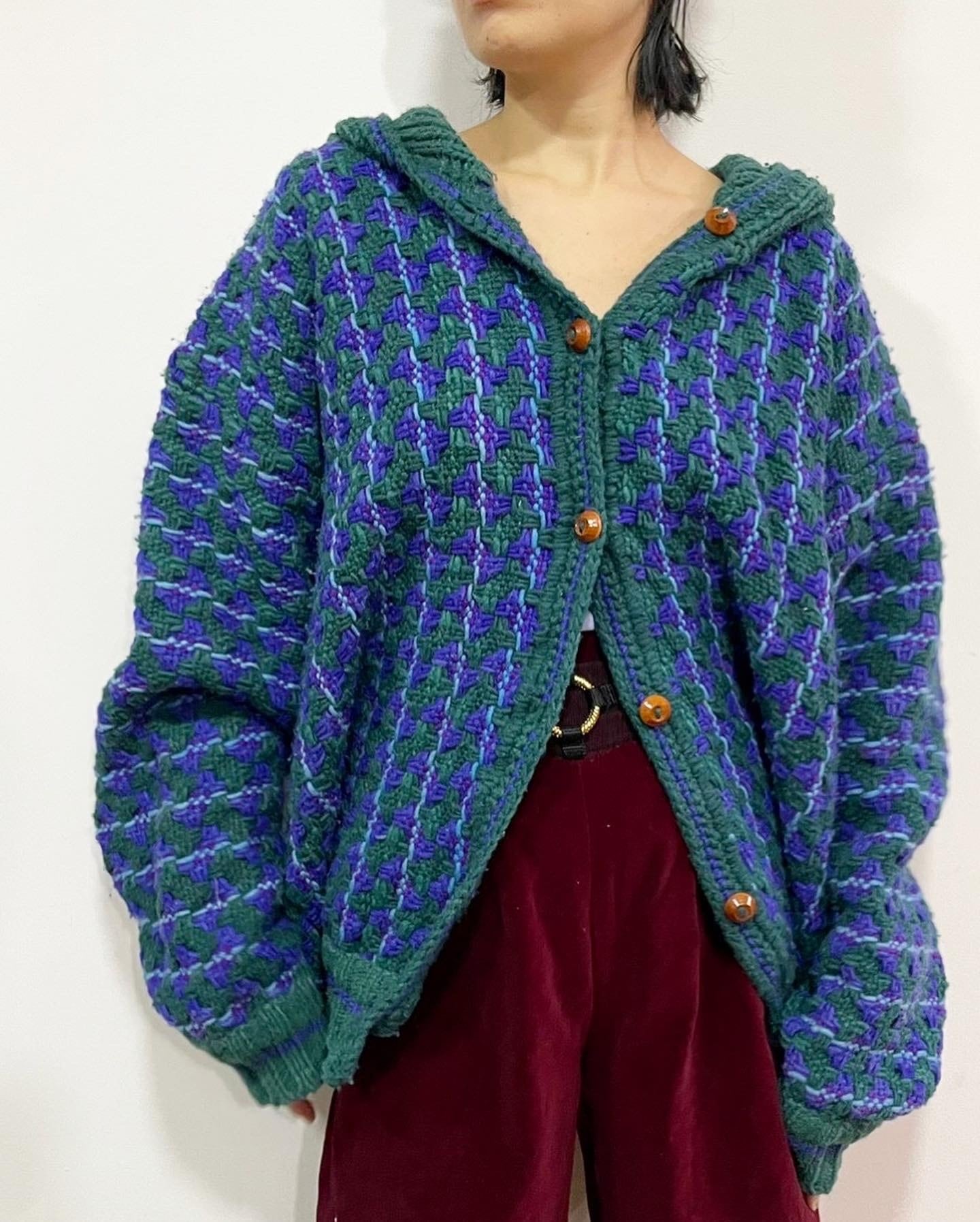 立体感のある編地で緑・青・紫色のmix色がレトロな演出とともにスタイリッシュな着こなしを演出してくれるでしょう。