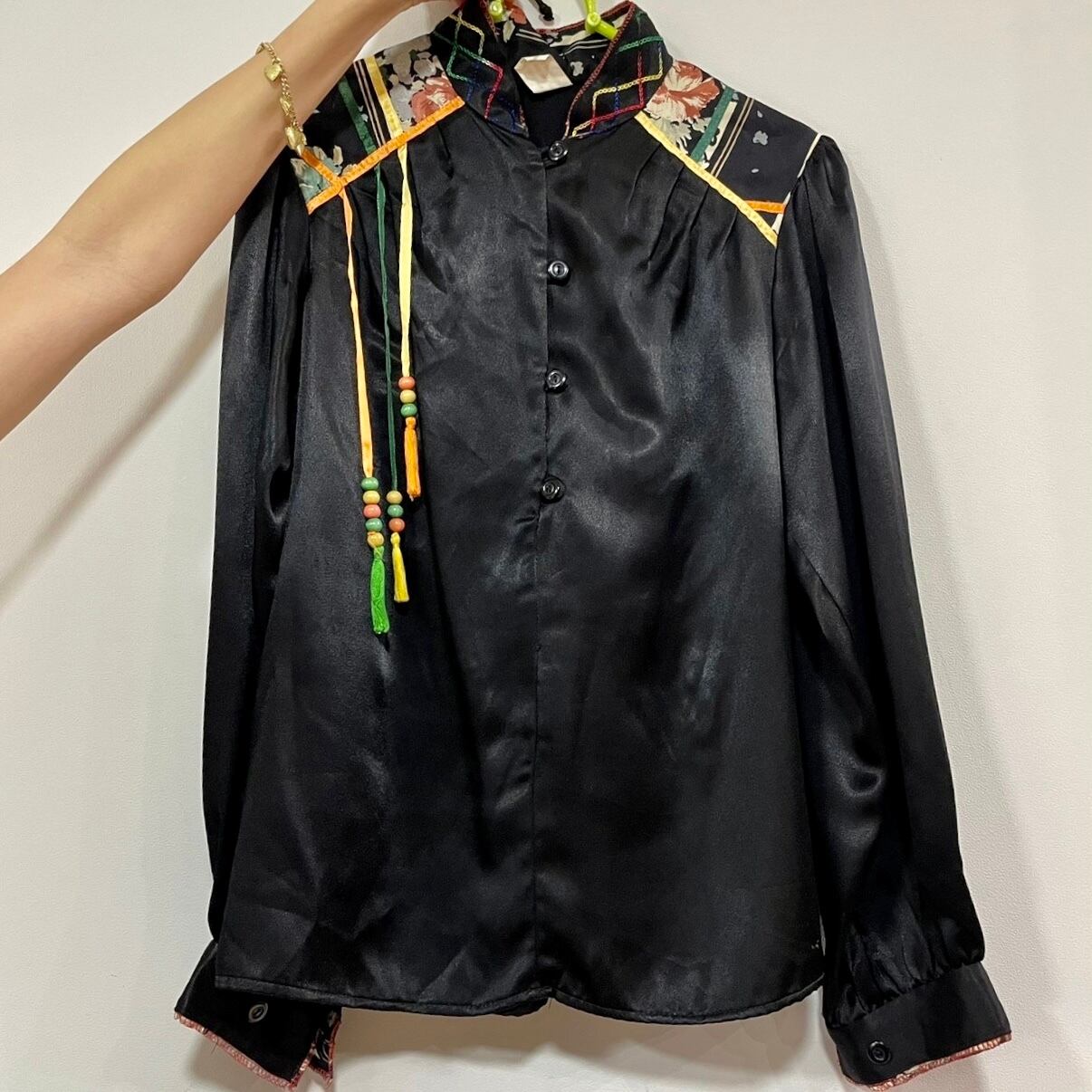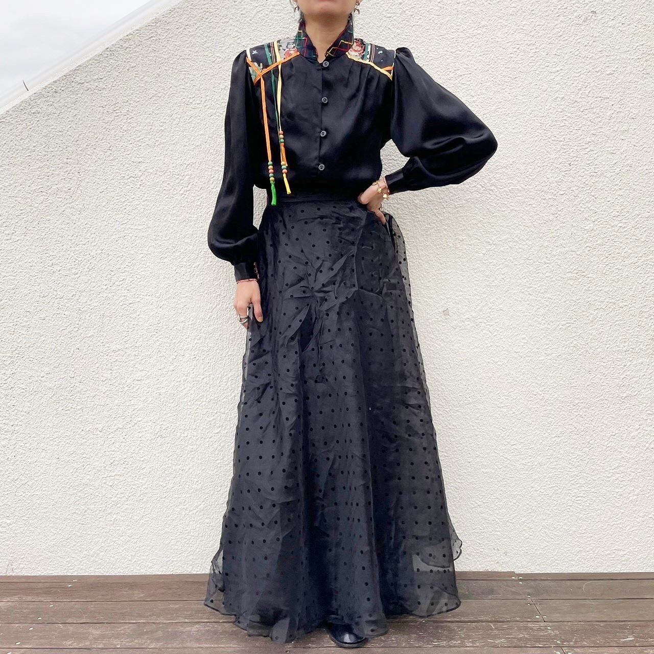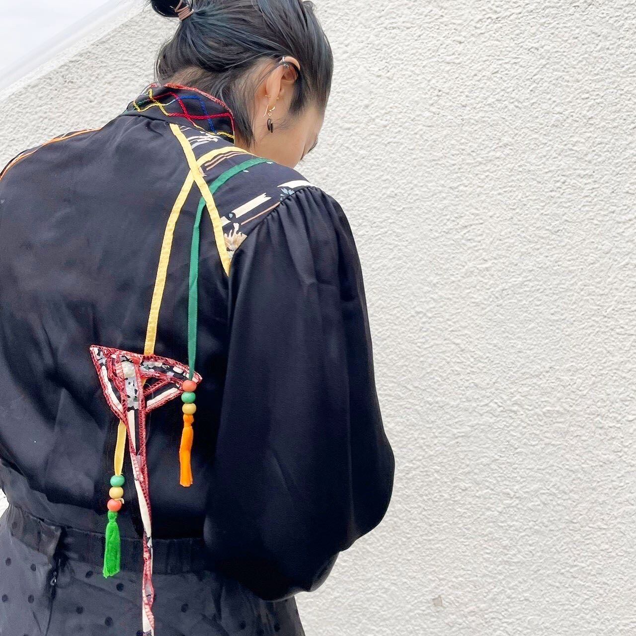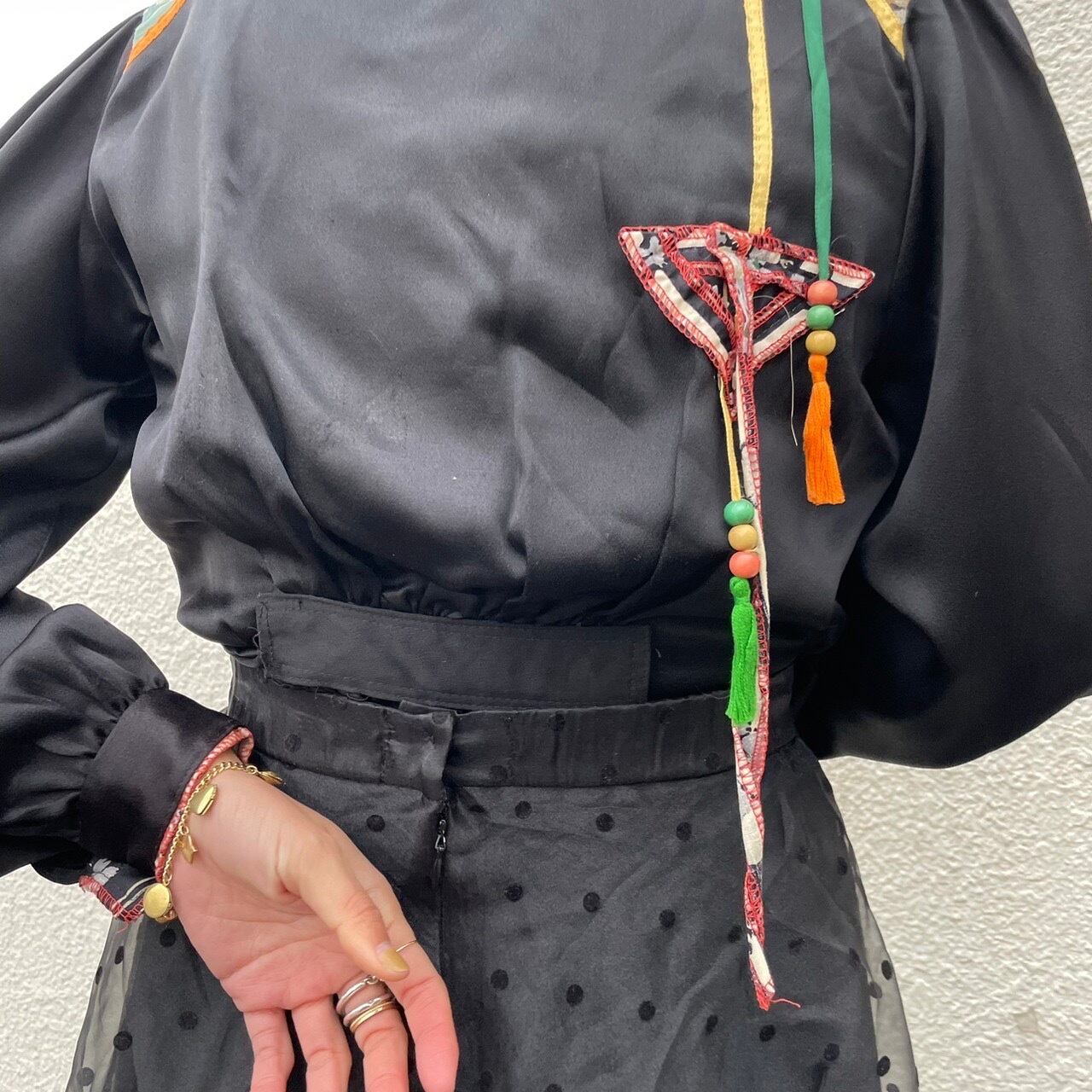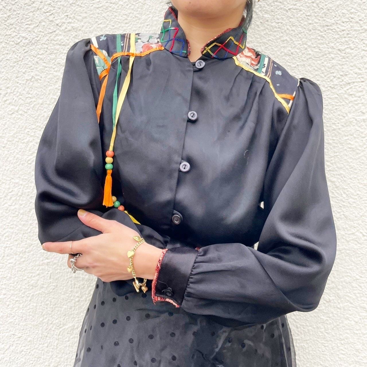 ショルダーからのカラフルなリボンとビーズのモチーフが前身、後身と細部までこだわられているblouse。