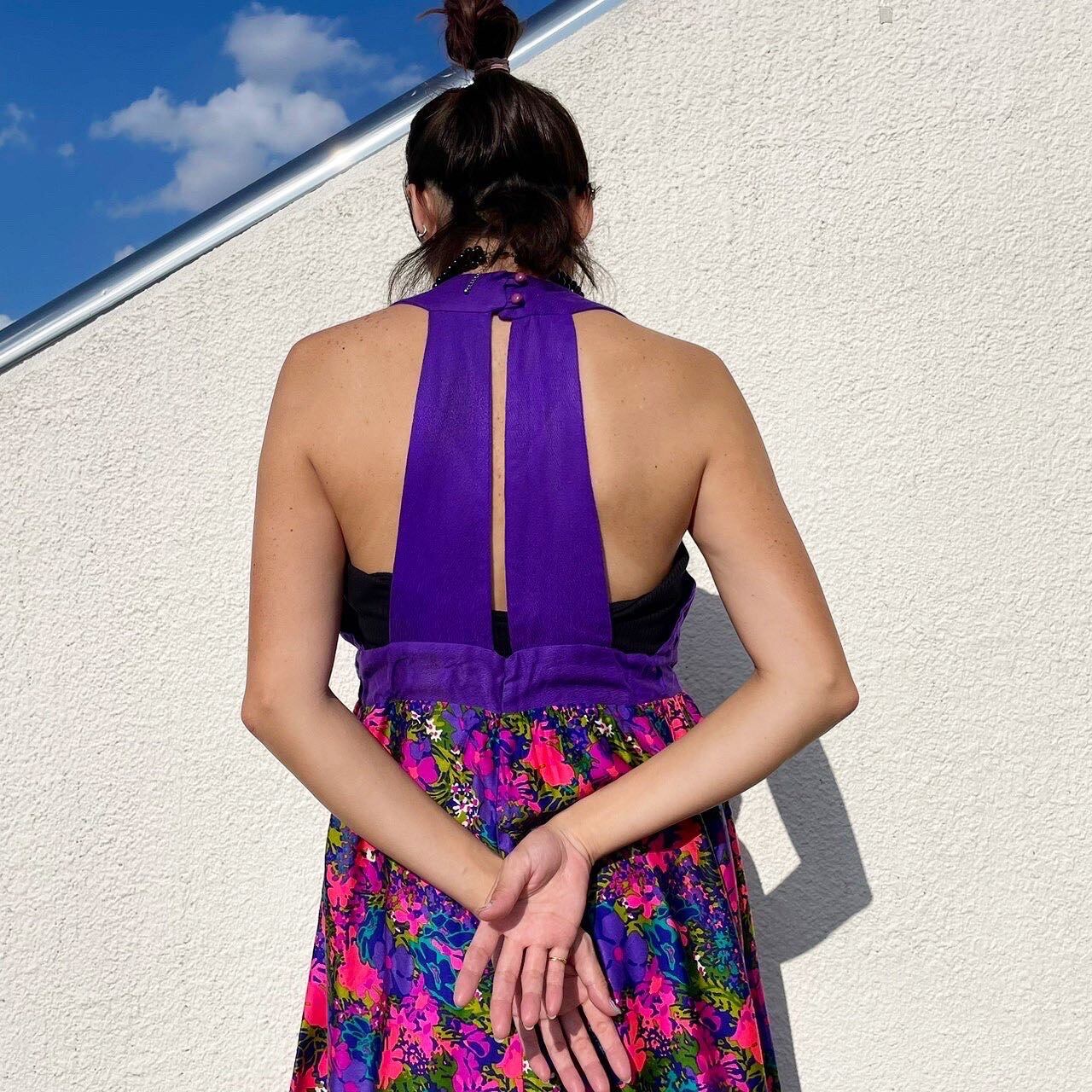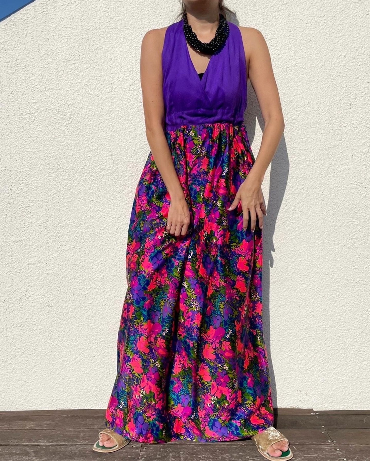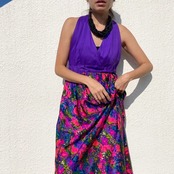らしいレトロフラワーパターンとパープルカラーとのコンビ。